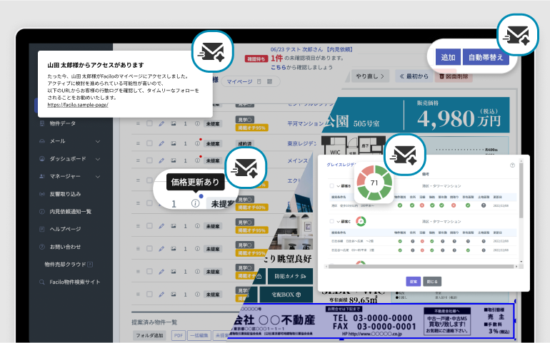 検索条件登録や価格変更キャッチ機能を組み合わせることで、常に最新の情報を顧客へ即提案できます。