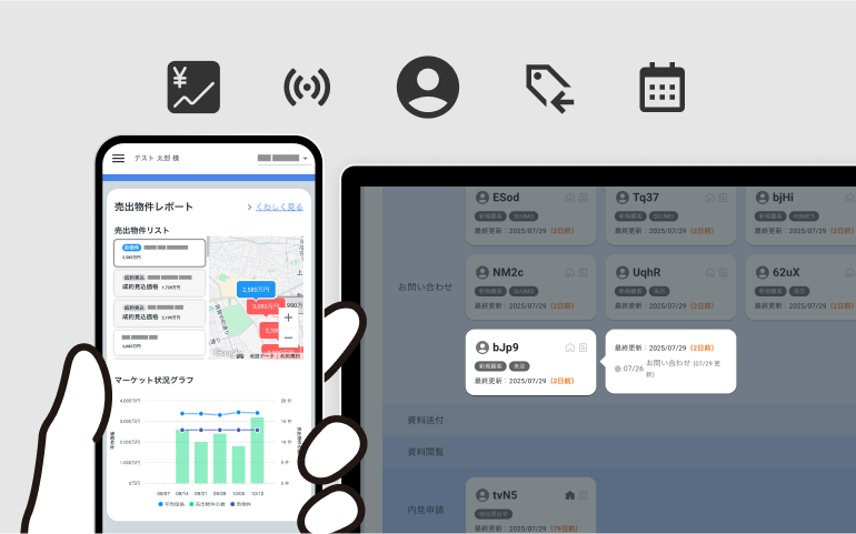 売主専用マイページで、販売状況・反響・報告書をいつでも閲覧可能。 紙の報告やメール送付が不要になり、「いつでも確認できる安心感」を提供します。
