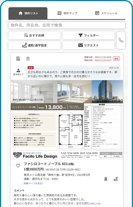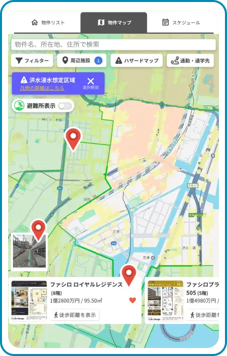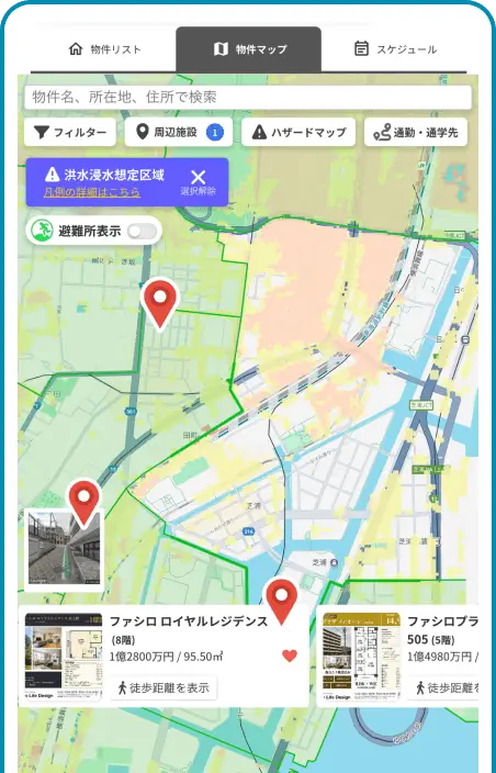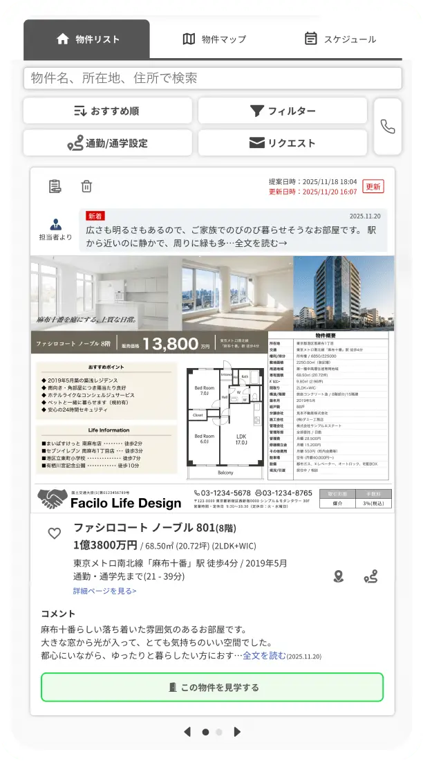 物件リストで、営業担当が提案した物件の一覧をご確認いただけます。物件マップではスーパー・コンビニ・病院などの周辺施設や小中学校の学区もチェックできます。