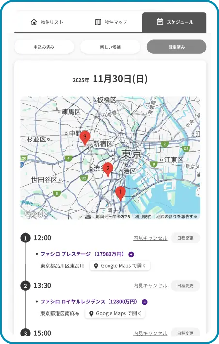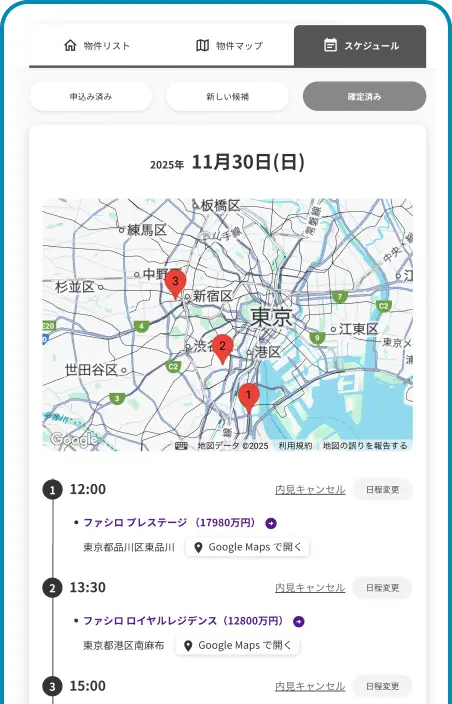 予約からスケジュール確認、現地での見学までがひと続きになり、気になる物件をスムーズに確かめられます。