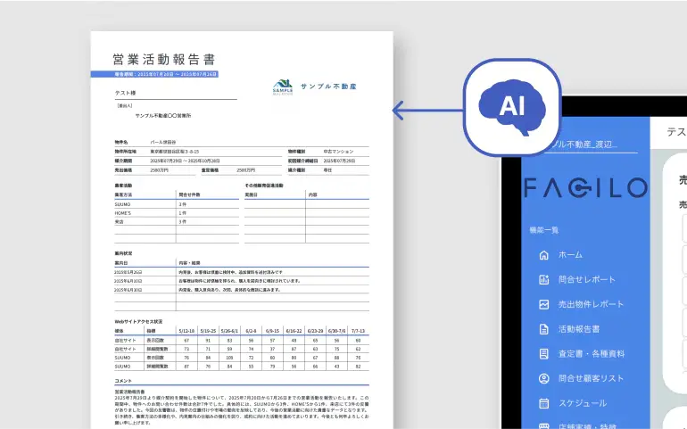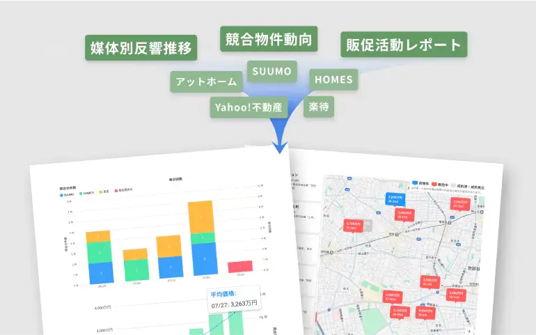 媒体別の反響数推移や競合物件の動向を自動で集計・グラフ化し、手作業での集計業務を削減します。販売促進活動の情報も自動でレポートに反映され、日々の営業努力を可視化できます。