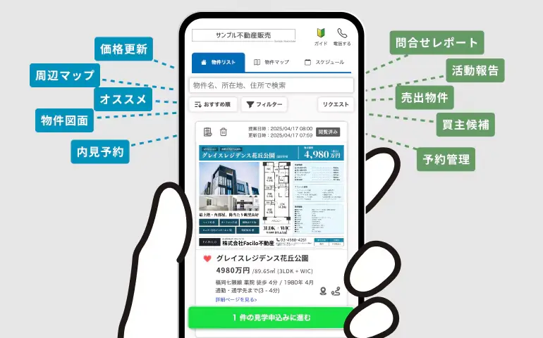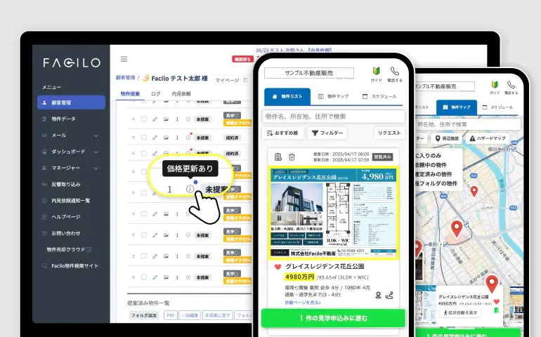 購入検討中の顧客には物件マップや価格変更情報を、売却依頼の顧客には活動報告や市場分析レポートを即座に提供。
