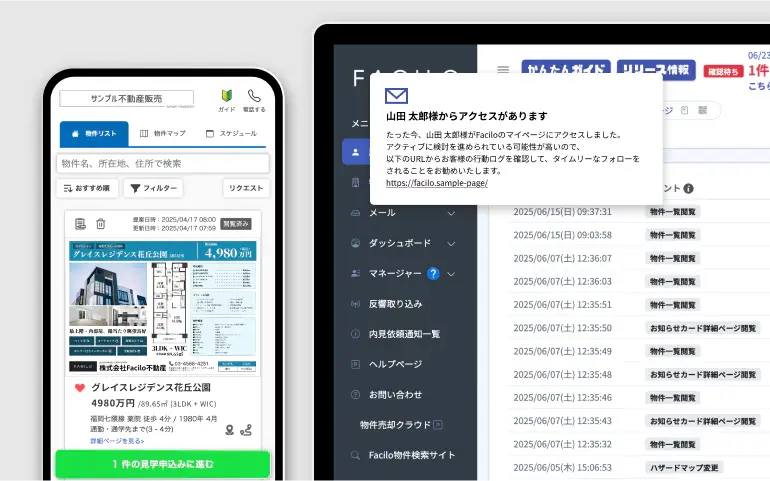 最適なフォロータイミングを把握マイページの閲覧通知機能により、顧客がいつどの物件を見たかをリアルタイムで把握できます。